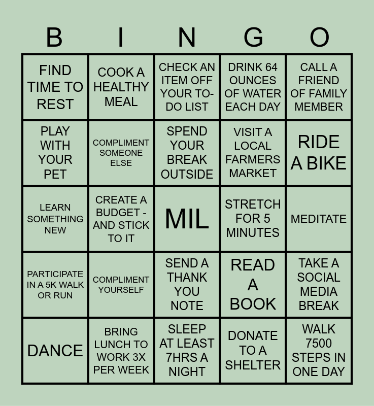 This bingo card has a free space and 49 words: MAKE SOMEONE LAUGH, WALK 7500 STEPS IN ONE DAY, LISTEN TO YOUR FAVORITE SONG, SLEEP AT LEAST 7HRS A NIGHT, COMPLIMENT YOURSELF, EXERCISE FOR 30 MINUTES, COOK A HEALTHY MEAL, WRITE IN A JOURNAL, PLAY WITH YOUR PET, TRY A NEW FRUIT OR VEGETABLE, COMPLIMENT SOMEONE ELSE, DRINK 64 OUNCES OF WATER EACH DAY, TAKE A SOCIAL MEDIA BREAK, READ A BOOK, PERFORM RANDOM ACT OF KINDNESS, EAT A HEALTHY LUNCH, SPEND YOUR BREAK OUTSIDE, STRETCH FOR 5 MINUTES, VOLUNTEER, CALL A FRIEND OF FAMILY MEMBER, CREATE A BUDGET - AND STICK TO IT, DONATE TO A SHELTER, FIND TIME TO REST, VISIT A LOCAL FARMERS MARKET, SMILE, RIDE A BIKE, DANCE, DO A CRAFT OR ART PROJECT, SEND A THANK YOU NOTE, PARTICIPATE IN A 5K WALK OR RUN, SAY HI TO A STRANGER, SET A WELLNESS GOAL, PLAN A TRIP, PLAY A BOARD GAME, BRING LUNCH TO WORK 3X PER WEEK, DECLUTTER YOUR WORKSPACE OR HOME, ENJOY LIFE, TAKE A DEEP BREATH, MEDITATE, TREAT YOURSELF TO SOMETHING SPECIAL, SCHEDULE A WELLNESS CHECK-UP, PRACTICE POSITIVE THINKING, CHECK ON A NEIGHBOR, PARTICIPATE IN A WELLNESS CHALLENGE, LEARN SOMETHING NEW, CHECK AN ITEM OFF YOUR TO-DO LIST, WATCH A WELLNESS WEBINAR, LIST 3 THINGS YOU ARE GRATEFUL FOR and EAT LUNCH WITH SOMEONE NEW.