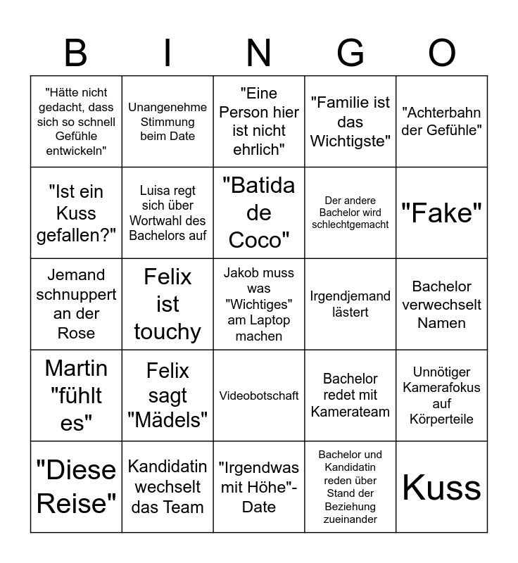 This bingo card has 25 words: Felix sagt "Mädels", "Irgendwas mit Höhe"-Date, "Batida de Coco", "Diese Reise", "Achterbahn der Gefühle", "Hätte nicht gedacht, dass sich so schnell Gefühle entwickeln", "Ist ein Kuss gefallen?", Unangenehme Stimmung beim Date, Irgendjemand lästert, Videobotschaft, Der andere Bachelor wird schlechtgemacht, Jemand schnuppert an der Rose, Bachelor redet mit Kamerateam, Unnötiger Kamerafokus auf Körperteile, Luisa regt sich über Wortwahl des Bachelors auf, Kuss, Bachelor verwechselt Namen, "Eine Person hier ist nicht ehrlich", "Fake", Felix ist touchy, Jakob muss was "Wichtiges" am Laptop machen, Kandidatin wechselt das Team, Martin "fühlt es", "Familie ist das Wichtigste" and Bachelor und Kandidatin reden über Stand der Beziehung zueinander.
