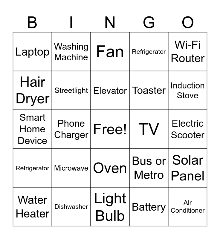 This bingo card has a free space and 24 words: Microwave, Dishwasher, Elevator, Water Heater, Wi-Fi Router, Laptop, Hair Dryer, Washing Machine, TV, Oven, Toaster, Smart Home Device, Bus or Metro, Solar Panel, Streetlight, Battery, Electric Scooter, Fan, Induction Stove, Phone Charger, Air Conditioner, Refrigerator, Refrigerator and Light Bulb.