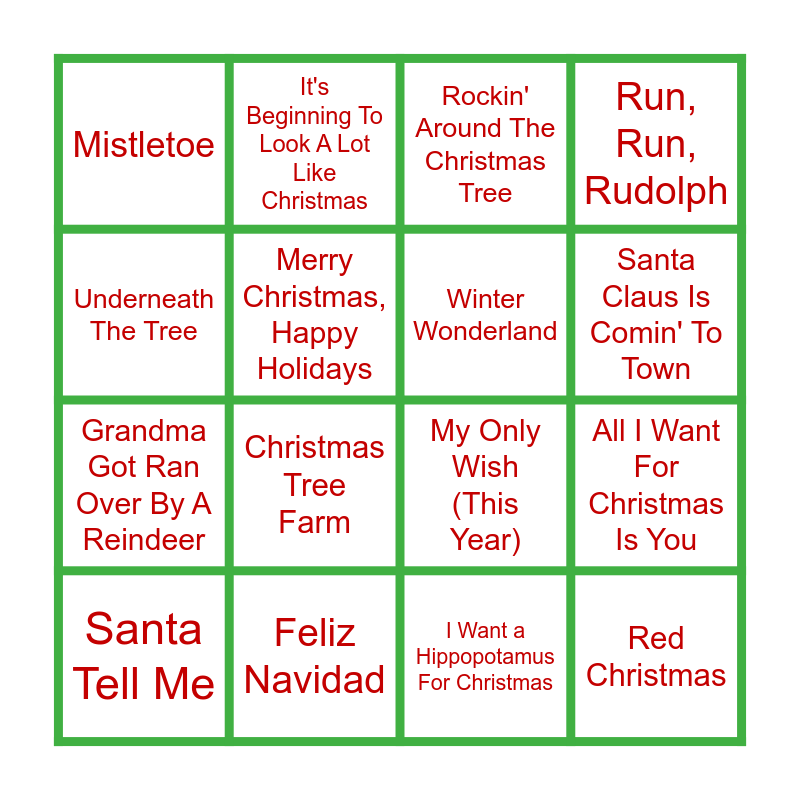 This bingo card has 20 words: All I Want For Christmas Is You, Last Christmas, Rockin' Around The Christmas Tree, Jingle Bell Rock, Santa Tell Me, Underneath The Tree, Feliz Navidad, Mistletoe, Grandma Got Ran Over By A Reindeer, It's Beginning To Look A Lot Like Christmas, Christmas Tree Farm, My Only Wish (This Year), Merry Christmas, Happy Holidays, Red Christmas, Winter Wonderland, The Twelve Days Of Christmas, Santa Claus Is Comin' To Town, Run, Run, Rudolph, I Want a Hippopotamus For Christmas and Winter Wonderland / Here Comes Santa Claus.