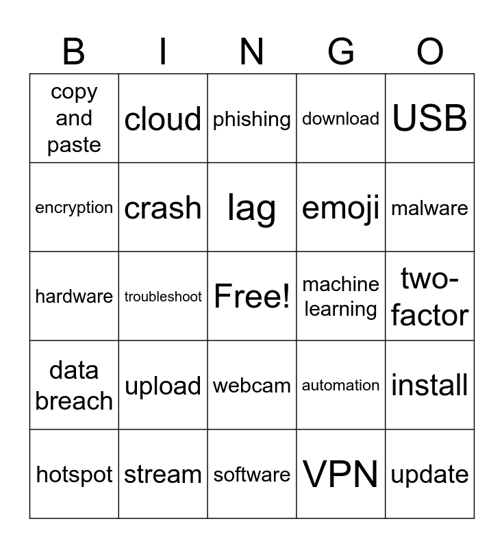This bingo card has a free space and 24 words: upload, stream, lag, hotspot, USB, copy and paste, encryption, cloud, machine learning, webcam, emoji, hardware, automation, install, crash, VPN, two-factor, phishing, malware, troubleshoot, update, data breach, download and software.