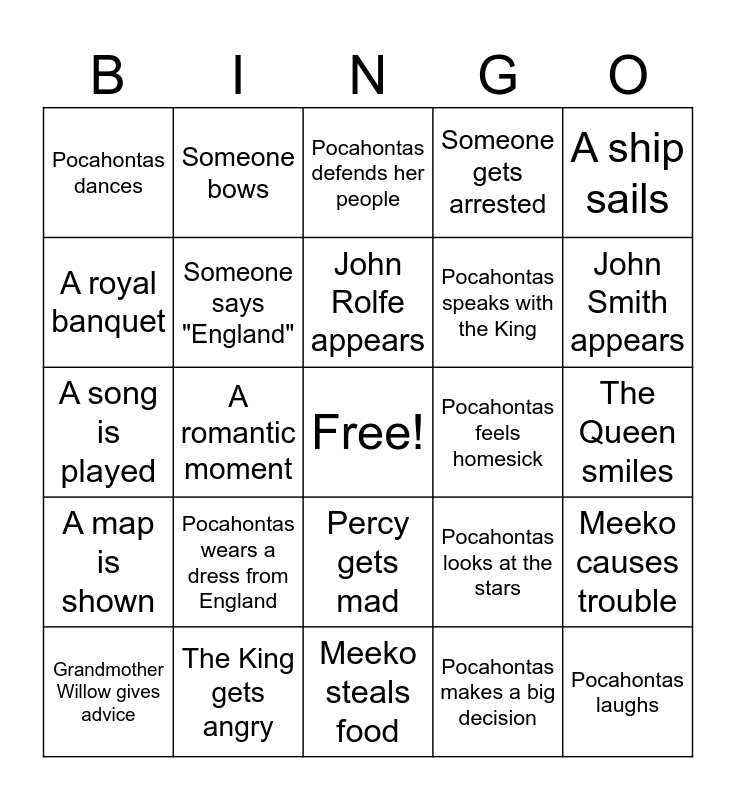 This bingo card has a free space and 25 words: Pocahontas wears a dress from England, Meeko steals food, John Rolfe appears, Grandmother Willow gives advice, A ship sails, Pocahontas dances, A royal banquet, Someone bows, Pocahontas feels homesick, Percy gets mad, Pocahontas speaks with the King, A song is played, Pocahontas looks at the stars, Meeko causes trouble, Someone says "England", A letter is read, The Queen smiles, Pocahontas defends her people, John Smith appears, A romantic moment, Pocahontas laughs, The King gets angry, A map is shown, Someone gets arrested and Pocahontas makes a big decision.