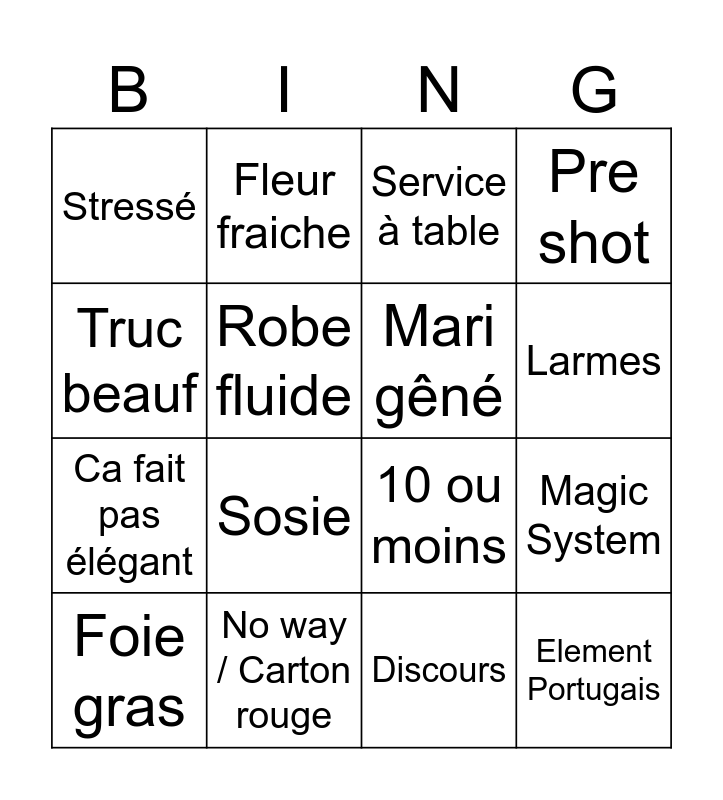 This bingo card has 16 words: No way / Carton rouge, Magic System, Service à table, Stressé, Ca fait pas élégant, Fleur fraiche, 10 ou moins, Discours, Truc beauf, Robe fluide, Foie gras, Pre shot, Sosie, Larmes, Mari gêné and Element Portugais.