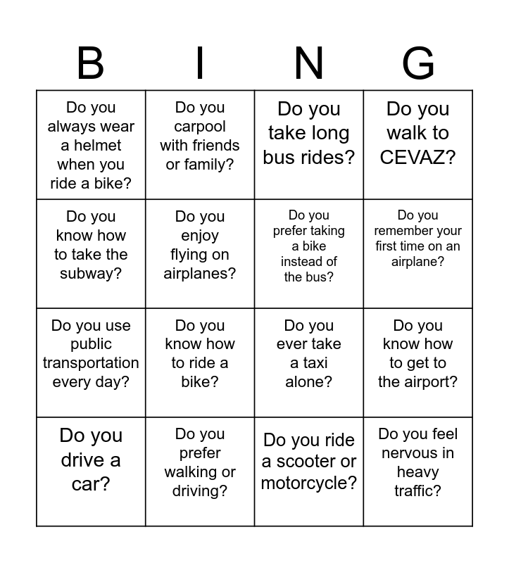 This bingo card has 16 words: Do you prefer walking or driving?, Do you know how to get to the airport?, Do you take long bus rides?, Do you always wear a helmet when you ride a bike?, Do you use public transportation every day?, Do you carpool with friends or family?, Do you ever take a taxi alone?, Do you ride a scooter or motorcycle?, Do you know how to take the subway?, Do you enjoy flying on airplanes?, Do you drive a car?, Do you walk to CEVAZ?, Do you know how to ride a bike?, Do you remember your first time on an airplane?, Do you prefer taking a bike instead of the bus? and Do you feel nervous in heavy traffic?.