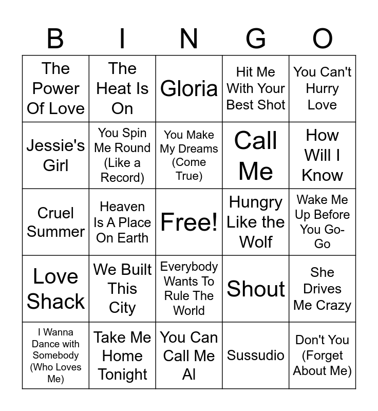 This bingo card has a free space and 40 words: Girls Just Want to Have Fun, Cruel Summer, Take on Me, You Spin Me Round (Like a Record), Take Me Home Tonight, Everybody Wants To Rule The World, You Make My Dreams (Come True), The Look, You Can't Hurry Love, Love Shack, Heaven Is A Place On Earth, Hit Me With Your Best Shot, Don't You (Forget About Me), Wake Me Up Before You Go-Go, Hungry Like the Wolf, We Built This City, Tainted Love, The Power Of Love, Karma Chameleon, Gloria, She Drives Me Crazy, Sussudio, Call Me, Jessie's Girl, When Doves Cry, Rosanna, Owner of a Lonely Heart, We Got The Beat, Your Love, Relax (Come Fighting), Hip To Be Square, I Wanna Dance with Somebody (Who Loves Me), The Boys Of Summer, Shout, How Will I Know, You Can Call Me Al, Just Can't Get Enough, Got My Mind Set on You, The Heat Is On and Mony Mony.