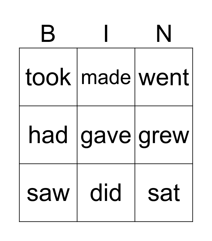 This bingo card has a free space and 17 words: drank, drove, went, took, bought, had, wrote, saw, did, grew, found, forgot, sat, made, thought, won and swam.