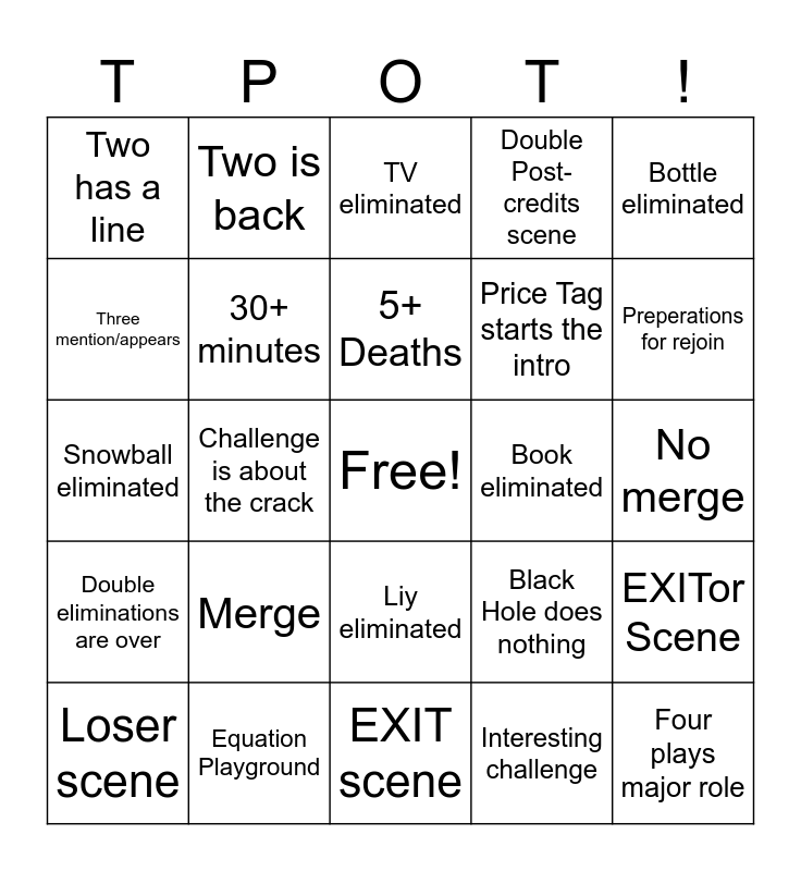 This bingo card has a free space and 24 words: Merge, Equation Playground, 5+ Deaths, Loser scene, Bottle eliminated, Two has a line, Three mention/appears, Two is back, Book eliminated, Liy eliminated, Price Tag starts the intro, Snowball eliminated, Black Hole does nothing, EXITor Scene, 30+ minutes, Interesting challenge, No merge, TV eliminated, Preperations for rejoin, Challenge is about the crack, Four plays major role, Double eliminations are over, Double Post-credits scene and EXIT scene.