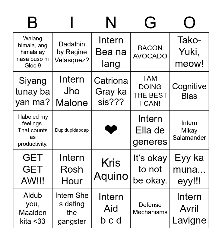 This bingo card has a free space and 29 words: Aldub you, Maalden kita <33, Hi kami ang pabebe girls, Dupidupidapdap, Mekeni mekeni dugdug doremi, Walang himala, ang himala ay nasa puso ni Gloc 9, Intern Bea na lang, Intern Jho Malone, Intern Rosh Hour, Intern Ella de generes, Intern She s dating the gangster, Intern Mikay Salamander, Intern Avril Lavigne, Intern Aid b c d, Defense Mechanisms, Cognitive Bias, Lawrence Kohlberg Theory, Kris Aquino, GET GET AW!!!, Tako-Yuki, meow!, I labeled my feelings. That counts as productivity., It’s okay to not be okay., Luis Manzano, I AM DOING THE BEST I CAN!, Siyang tunay ba yan ma?, BACON AVOCADO, Dadalhin by Regine Velasquez?, Eyy ka muna... eyy!!!, Catriona Gray ka sis??? and HAPPY SOCIALIZATION DAY!!!.