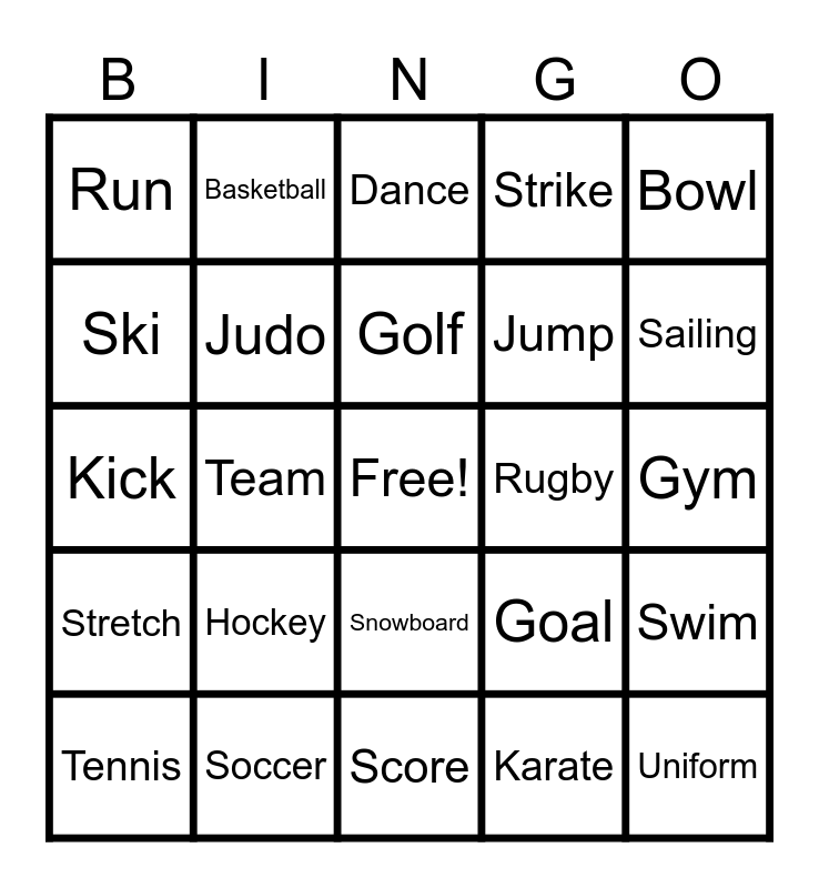 This bingo card has a free space and 24 words: Hockey, Soccer, Golf, Tennis, Bowl, Run, Ski, Basketball, Rugby, Snowboard, Jump, Kick, Goal, Swim, Judo, Karate, Gym, Dance, Sailing, Team, Uniform, Stretch, Strike and Score.