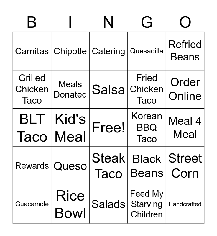 This bingo card has a free space and 24 words: Queso, Rice Bowl, Salsa, Guacamole, Refried Beans, Carnitas, Grilled Chicken Taco, Chipotle, Korean BBQ Taco, Steak Taco, Fried Chicken Taco, BLT Taco, Black Beans, Street Corn, Meals Donated, Feed My Starving Children, Meal 4 Meal, Catering, Order Online, Kid's Meal, Handcrafted, Rewards, Quesadilla and Salads.