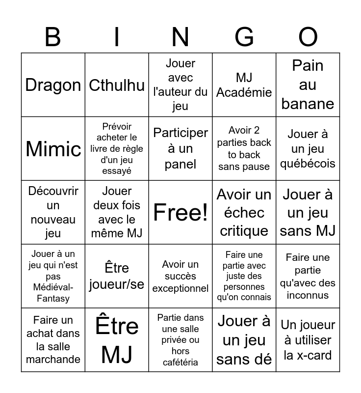 This bingo card has a free space and 24 words: Être joueur/se, Être MJ, Participer à un panel, Faire un achat dans la salle marchande, Pain au banane, Dragon, Mimic, Cthulhu, Avoir un échec critique, Avoir un succès exceptionnel, Avoir 2 parties back to back sans pause, Découvrir un nouveau jeu, Faire une partie avec juste des personnes qu'on connais, Faire une partie qu'avec des inconnus, Prévoir acheter le livre de règle d'un jeu essayé, Jouer à un jeu sans dé, Jouer à un jeu sans MJ, Jouer avec l'auteur du jeu, Jouer à un jeu québécois, Jouer deux fois avec le même MJ, Un joueur à utiliser la x-card, Jouer à un jeu qui n'est pas Médiéval-Fantasy, MJ Académie and Partie dans une salle privée ou hors cafétéria.