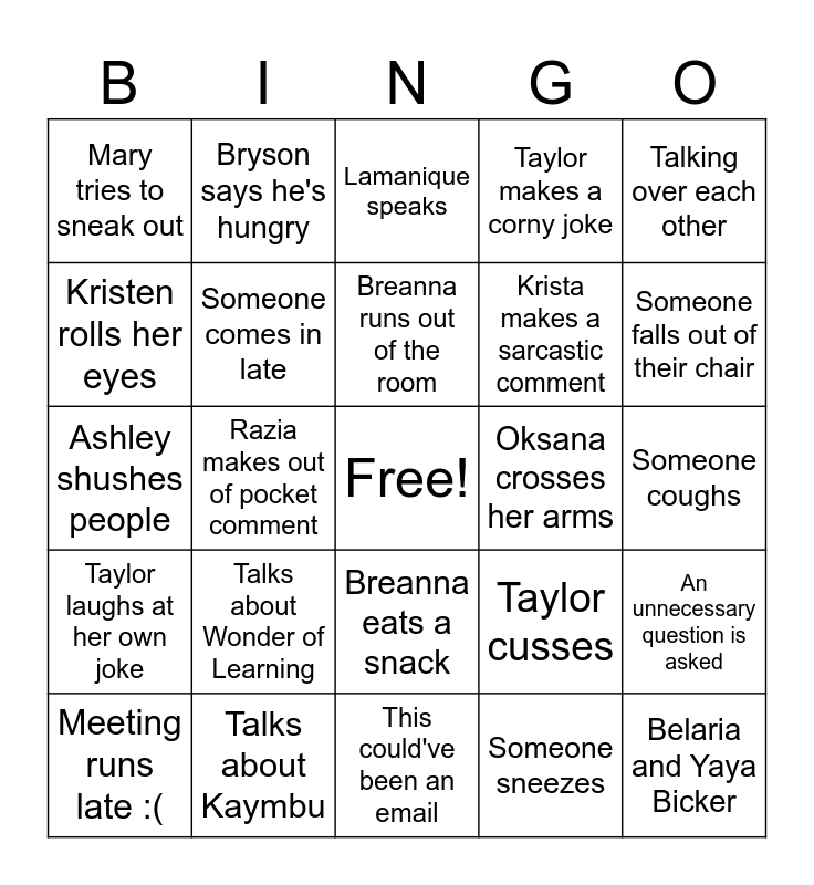 This bingo card has a free space and 24 words: Talks about Wonder of Learning, Talks about Kaymbu, Breanna runs out of the room, Meeting runs late :(, Talking over each other, Mary tries to sneak out, Kristen rolls her eyes, Bryson says he's hungry, Oksana crosses her arms, Breanna eats a snack, Krista makes a sarcastic comment, Ashley shushes people, Taylor cusses, An unnecessary question is asked, Someone comes in late, Someone sneezes, Someone coughs, Lamanique speaks, Someone falls out of their chair, Razia makes out of pocket comment, Belaria and Yaya Bicker, Taylor laughs at her own joke, Taylor makes a corny joke and This could've been an email.