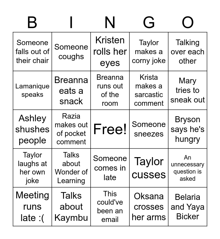 This bingo card has a free space and 24 words: Talks about Wonder of Learning, Talks about Kaymbu, Breanna runs out of the room, Meeting runs late :(, Talking over each other, Someone falls out of their chair, Lamanique speaks, Someone coughs, Someone sneezes, Someone comes in late, Krista makes a sarcastic comment, Ashley shushes people, Taylor cusses, An unnecessary question is asked, Breanna eats a snack, Oksana crosses her arms, Bryson says he's hungry, Kristen rolls her eyes, Mary tries to sneak out, Razia makes out of pocket comment, Belaria and Yaya Bicker, Taylor laughs at her own joke, Taylor makes a corny joke and This could've been an email.