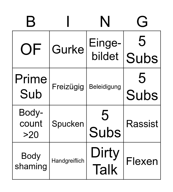 This bingo card has 16 words: Handgreiflich, Rassist, Einge- bildet, OF, Body- count >20, Gurke, 5 Subs, Dirty Talk, Prime Sub, Freizügig, Body shaming, 5 Subs, Spucken, 5 Subs, Beleidigung and Flexen.