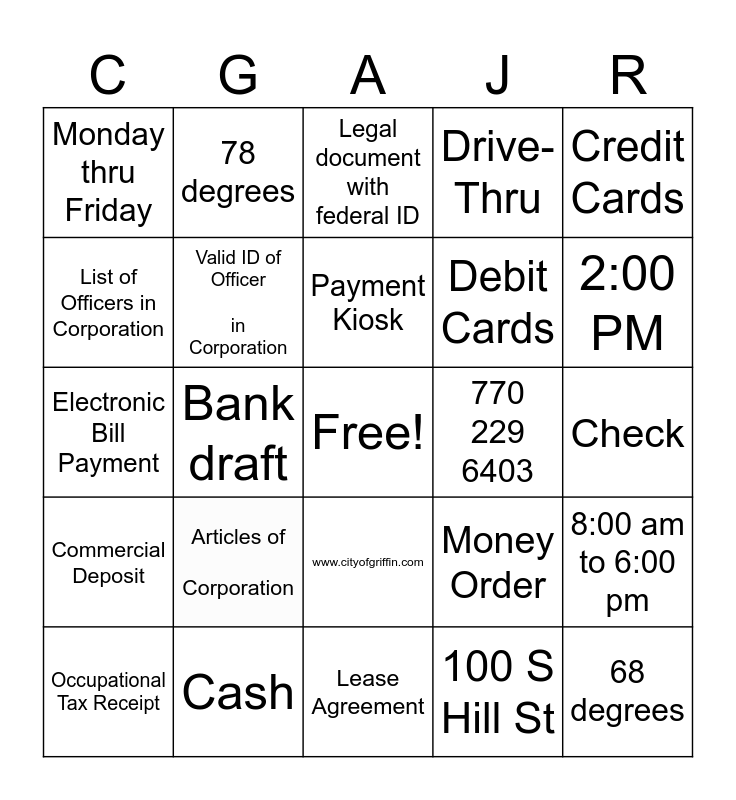 This bingo card has a free space and 24 words: Articles of Corporation, Cash, Payment Kiosk, Occupational Tax Receipt, Credit Cards, Monday thru Friday, List of Officers in Corporation, 78 degrees, 770 229 6403, www.cityofgriffin.com, Debit Cards, Electronic Bill Payment, Money Order, 8:00 am to 6:00 pm, Valid ID of Officer in Corporation, 100 S Hill St, Check, Legal document with federal ID, 2:00 PM, Bank draft, 68 degrees, Commercial Deposit, Drive-Thru and Lease Agreement.