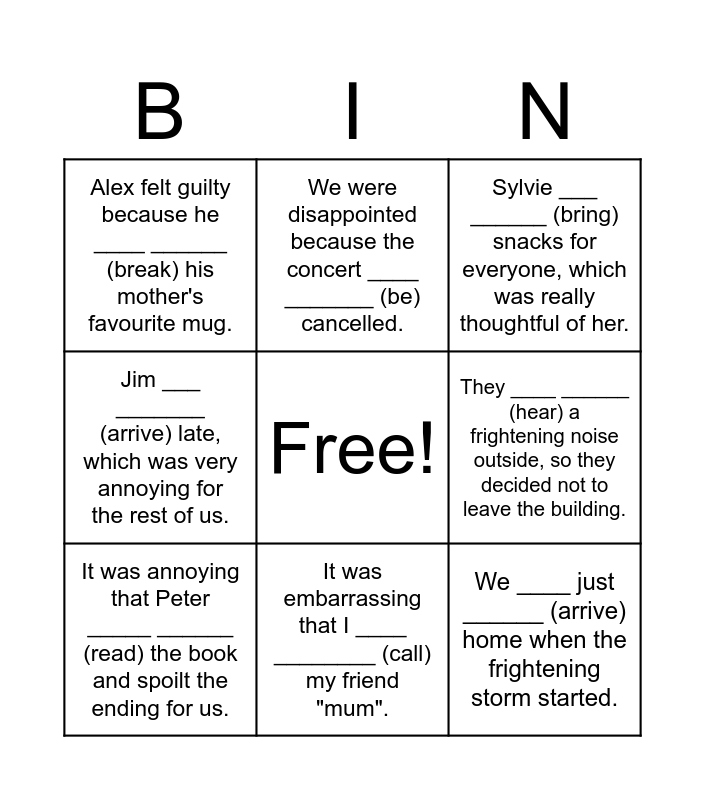 This bingo card has a free space and 14 words: Laura felt guilty because she ____ ______ (lie) to her parents., Stuart was embarrassed because he _____ ________ (fall) off the stage during the show., It was annoying that Peter _____ ______ (read) the book and spoilt the ending for us., We were disappointed because the concert ____ _______ (be) cancelled., Jim ___ _______ (arrive) late, which was very annoying for the rest of us., We ____ just ______ (arrive) home when the frightening storm started., Jenny was amazed because her little sister ____ _______ (solve) the puzzle very fast!, Becky was annoyed because her daughter ______ __________ (not listen) to her., It was embarrassing that I ____ ________ (call) my friend "mum"., Alex felt guilty because he ____ ______ (break) his mother's favourite mug., Stacey felt embarrassed because she _______ ___________ (not understand) the joke., They ____ ______ (hear) a frightening noise outside, so they decided not to leave the building., Sylvie ___ ______ (bring) snacks for everyone, which was really thoughtful of her. and We felt disappointed because we _____ _________ (not buy) the tickets for the concert in time..