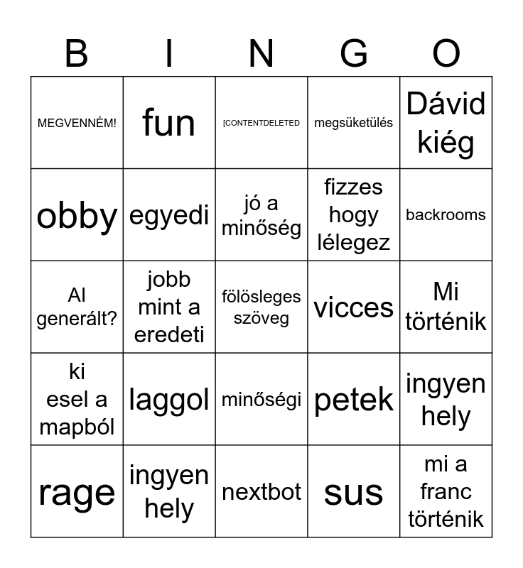 This bingo card has a free space and 39 words: Ez Roblox?, poppyplaytime, nincs gameplay, egyedi, rage, minőségi, jó a minőség, jó a zene, Dávid kiég, ki esel a mapból, jobb mint a eredeti, megsüketülés, mi a franc történik, Mi történik, vicces, laggol, kabala horror, MEGVENNÉM!, borzalmas, petek, obby, nextbot, fizzes hogy lélegez, backrooms, 20Mil megtekintés, 50mil megtekintés, ingyen hely, másolat/ copy, GOTY2024, fun, szinkronizált, 15milmegtekintés, [CONTENTDELETED, ingyen hely, sus, Robloxbaseplatelátható, ingyen hely, AI generált? and van sztori?.