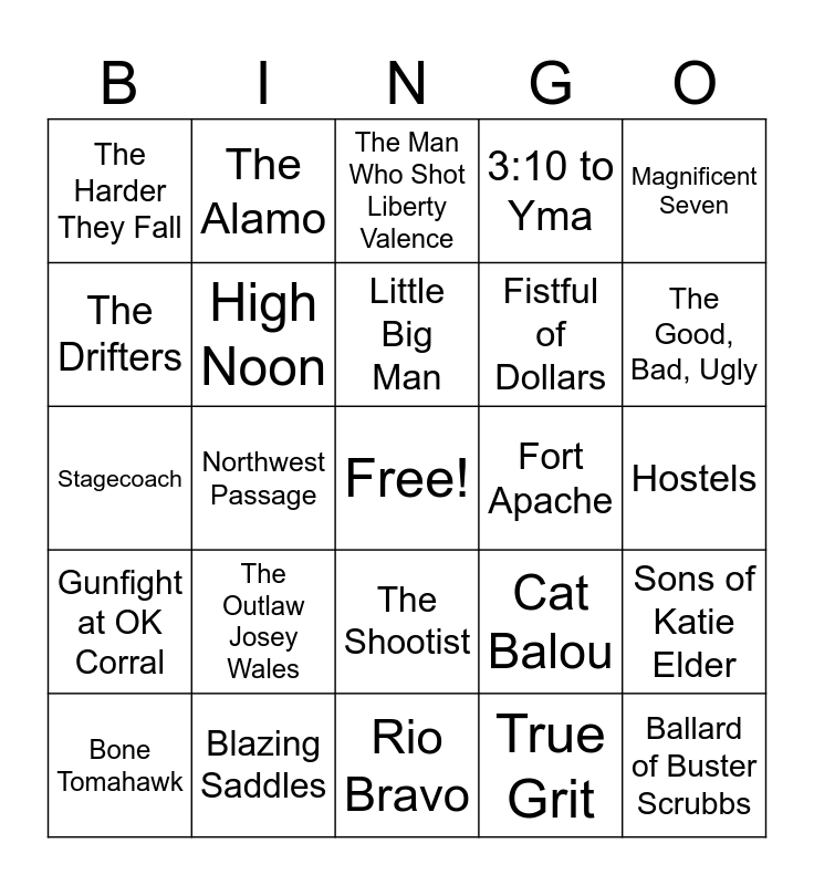 This bingo card has a free space and 25 words: The Outlaw Josey Wales, Rio Bravo, Little Big Man, Bone Tomahawk, Magnificent Seven, The Harder They Fall, The Drifters, The Alamo, Fort Apache, The Shootist, Fistful of Dollars, Stagecoach, Cat Balou, Sons of Katie Elder, High Noon, Hang Em High, Hostels, The Man Who Shot Liberty Valence, The Good, Bad, Ugly, Northwest Passage, Ballard of Buster Scrubbs, Blazing Saddles, Gunfight at OK Corral, 3:10 to Yma and True Grit.