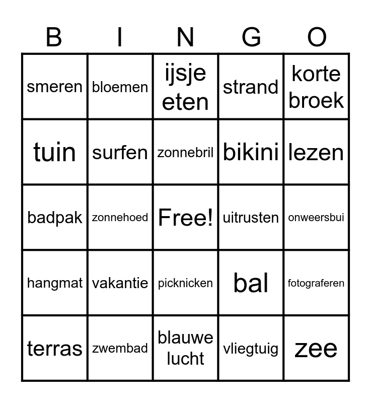 This bingo card has a free space and 37 words: barbecueën, zwemmen, duiken, surfen, fotograferen, vakantie, zonnebril, warm, korte broek, jurk, zonnehoed, strand, zee, onweersbui, tuin, hangmat, cocktail, ijsje eten, picknicken, uitrusten, smeren, lezen, terras, blauwe lucht, heet, vliegtuig, bloemen, vlinder, kamperen, zonnebrandcrème, zonnebloem, zwembad, badpak, slippers, bal, bikini and gras.