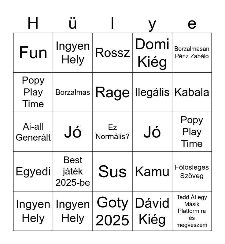 ⚠ This card has duplicate items: Ingyen Hely (4), Dávid Kiég (2), Lopott (2), Borzalmas (2), Rage Quite (2), Domi Kiég (2), Vicces (2), Popy Play Time (2), Sus (2), Laggol (2), Fun (2), Tedd Át egy Másik Platform ra és megveszem (2), Borzalmasan Pénz Zabáló (2), Ai-all Generált (2), Jó (2), Rossz (2)