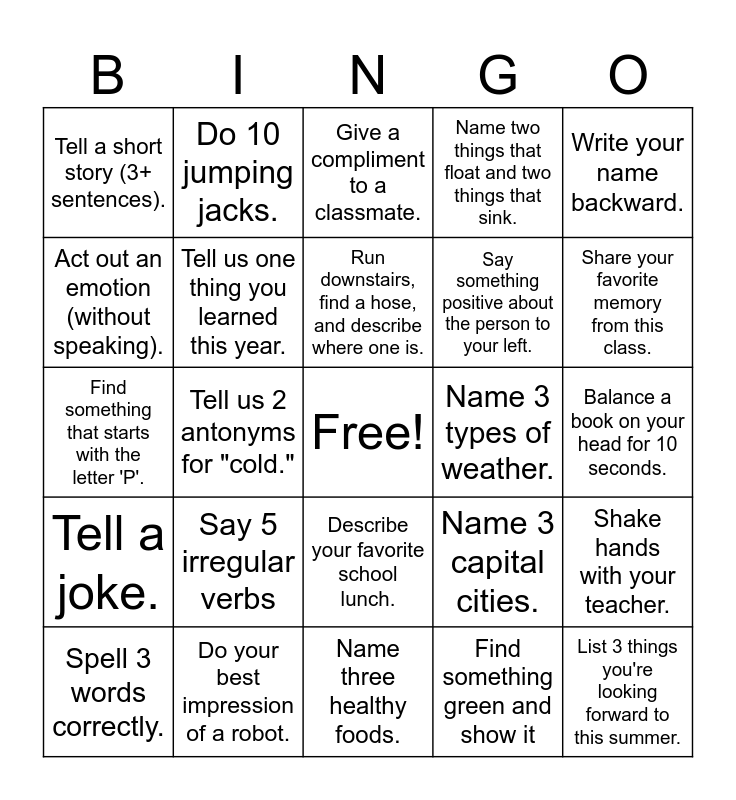 This bingo card has a free space and 24 words: Spell 3 words correctly., Say 5 irregular verbs, Run downstairs, find a hose, and describe where one is., Find something green and show it, Write your name backward., Tell a short story (3+ sentences)., Do 10 jumping jacks., Give a compliment to a classmate., Name 3 types of weather., Balance a book on your head for 10 seconds., Find something that starts with the letter 'P'., Tell us one thing you learned this year., Name 3 capital cities., Shake hands with your teacher., Act out an emotion (without speaking)., Do your best impression of a robot., Name three healthy foods., Name two things that float and two things that sink., Share your favorite memory from this class., Tell a joke., Tell us 2 antonyms for "cold.", Describe your favorite school lunch., Say something positive about the person to your left. and List 3 things you're looking forward to this summer..