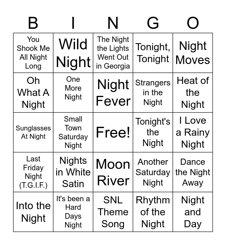 This bingo card has a free space and 24 words: Nights in White Satin, It's been a Hard Days Night, Night Fever, Into the Night, Night Moves, You Shook Me All Night Long, Oh What A Night, Wild Night, Tonight's the Night, Moon River, Strangers in the Night, Sunglasses At Night, Another Saturday Night, Dance the Night Away, One More Night, Rhythm of the Night, I Love a Rainy Night, The Night the Lights Went Out in Georgia, Heat of the Night, Small Town Saturday Night, Night and Day, Last Friday Night (T.G.I.F.), Tonight, Tonight and SNL Theme Song.