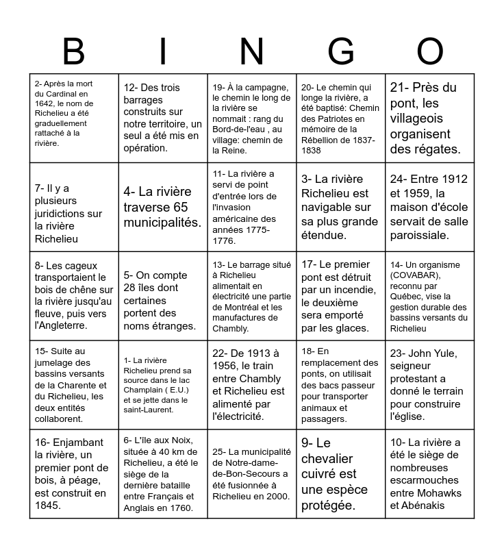 This bingo card has a free space and 24 words: 1- La rivière Richelieu prend sa source dans le lac Champlain ( E.U.) et se jette dans le saint-Laurent., 6- L'île aux Noix, située à 40 km de Richelieu, a été le siège de la dernière bataille entre Français et Anglais en 1760., 11- La rivière a servi de point d'entrée lors de l'invasion américaine des années 1775-1776., 16- Enjambant la rivière, un premier pont de bois, à péage, est construit en 1845., 21- Près du pont, les villageois organisent des régates., 2- Après la mort du Cardinal en 1642, le nom de Richelieu a été graduellement rattaché à la rivière., 7- Il y a plusieurs juridictions sur la rivière Richelieu, 12- Des trois barrages construits sur notre territoire, un seul a été mis en opération., 17- Le premier pont est détruit par un incendie, le deuxième sera emporté par les glaces., 22- De 1913 à 1956, le train entre Chambly et Richelieu est alimenté par l'électricité., 3- La rivière Richelieu est navigable sur sa plus grande étendue., 8- Les cageux transportaient le bois de chêne sur la rivière jusqu'au fleuve, puis vers l'Angleterre., 18- En remplacement des ponts, on utilisait des bacs passeur pour transporter animaux et passagers., 23- John Yule, seigneur protestant a donné le terrain pour construire l'église., 4- La rivière traverse 65 municipalités., 9- Le chevalier cuivré est une espèce protégée., 14- Un organisme (COVABAR), reconnu par Québec, vise la gestion durable des bassins versants du Richelieu, 19- À la campagne, le chemin le long de la rivière se nommait : rang du Bord-de-l'eau , au village: chemin de la Reine., 24- Entre 1912 et 1959, la maison d'école servait de salle paroissiale., 5- On compte 28 îles dont certaines portent des noms étranges., 10- La rivière a été le siège de nombreuses escarmouches entre Mohawks et Abénakis, 15- Suite au jumelage des bassins versants de la Charente et du Richelieu, les deux entités collaborent., 20- Le chemin qui longe la rivière, a été baptisé: Chemin des Patriotes en mémoire de la Rébellion de 1837-1838 and 25- La municipalité de Notre-dame-de-Bon-Secours a été fusionnée à Richelieu en 2000..