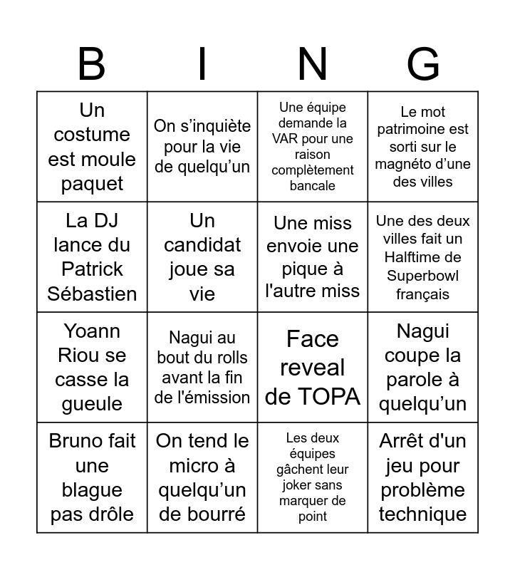 This bingo card has 16 words: On tend le micro à quelqu’un de bourré, Nagui coupe la parole à quelqu’un, Une équipe demande la VAR pour une raison complètement bancale, Un costume est moule paquet, Yoann Riou se casse la gueule, On s’inquiète pour la vie de quelqu’un, Face reveal de TOPA, Les deux équipes gâchent leur joker sans marquer de point, La DJ lance du Patrick Sébastien, Un candidat joue sa vie, Bruno fait une blague pas drôle, Le mot patrimoine est sorti sur le magnéto d’une des villes, Nagui au bout du rolls avant la fin de l'émission, Une des deux villes fait un Halftime de Superbowl français, Une miss envoie une pique à l'autre miss and Arrêt d'un jeu pour problème technique.