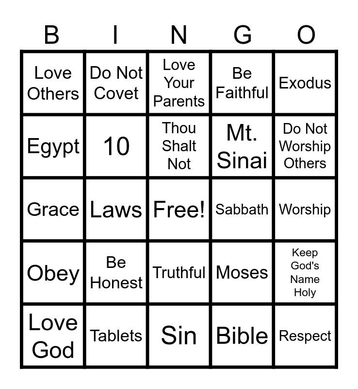 This bingo card has a free space and 24 words: Love God, Be Honest, Thou Shalt Not, Bible, Exodus, Love Others, Do Not Covet, Love Your Parents, Sabbath, Worship, Grace, 10, Moses, Keep God's Name Holy, Egypt, Tablets, Sin, Be Faithful, Do Not Worship Others, Obey, Laws, Truthful, Mt. Sinai and Respect.