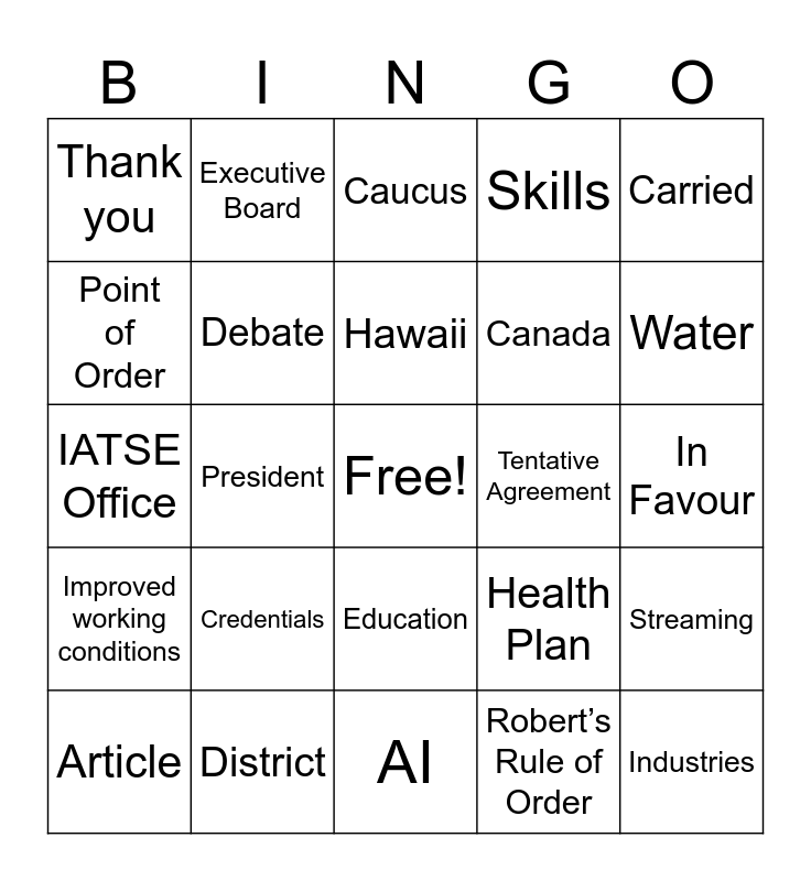 This bingo card has a free space and 92 words: Adjourn, AFL-CIO, AI, Aloha, Animation, Announcements, Area Standards, Article, Bargaining, Benefits, Break, Bulletin, Bylaws, Canada, Canadian, Carried, Caucus, CLC, Collective Agreement, Committee, Communications, Constitution, Convene, Convention, Credentials, Debate, Dedication, Department, Deserve, Disaster, District, Education, Employer, Empowered workers, Executive Board, Fire, General Secretary, Grievance, Hawaii, Health Plan, IATSE Office, Improved working conditions, In Favour, Increased wages, Industries, Leadership, Lobbying, Local, Local 891, Mahalo, Motion, Motion Picture, Officer, Opposed, Organizing, PAC, Party, Point of Order, Political, President, Proceedings, Production, Prosperity, Quadrennial, Resolutions, Robert’s Rule of Order, Safety, Second, Section, Security, Seniority, Sergeant-at-Arms, Skills, Solidarity, Speaker, Stage, Streaming, Strike vote, Studios, Subcontracting, Technologies, Tentative Agreement, Thank you, Tradeshow, Training, Training Trust Fund (TTF), Union Meeting, Vote, Workers, Sunscreen, Water and Beach.