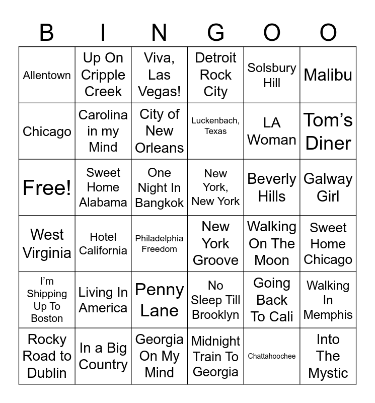 This bingo card has 36 words: No Sleep Till Brooklyn, Penny Lane, Midnight Train To Georgia, Chicago, West Virginia, New York, New York, Carolina in my Mind, Georgia On My Mind, Solsbury Hill, Going Back To Cali, Tom’s Diner, Detroit Rock City, Walking In Memphis, Sweet Home Alabama, Luckenbach, Texas, Allentown, I’m Shipping Up To Boston, Beverly Hills, Free!, Viva, Las Vegas!, One Night In Bangkok, Hotel California, New York Groove, Philadelphia Freedom, Walking On The Moon, Up On Cripple Creek, LA Woman, In a Big Country, City of New Orleans, Malibu, Into The Mystic, Rocky Road to Dublin, Sweet Home Chicago, Galway Girl, Living In America and Chattahoochee.