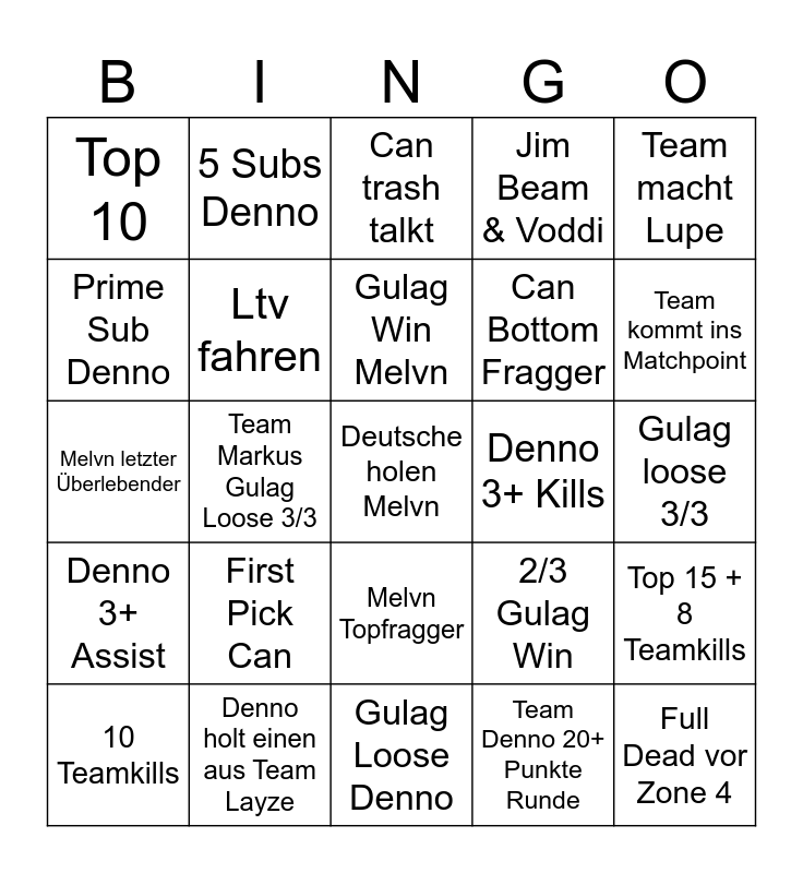 This bingo card has 25 words: First Pick Can, Gulag Loose Denno, Gulag Win Melvn, 10 Teamkills, Team macht Lupe, Top 10, Prime Sub Denno, 5 Subs Denno, Denno 3+ Kills, Melvn Topfragger, Can Bottom Fragger, Melvn letzter Überlebender, 2/3 Gulag Win, Top 15 + 8 Teamkills, Ltv fahren, Full Dead vor Zone 4, Gulag loose 3/3, Can trash talkt, Team kommt ins Matchpoint, Team Markus Gulag Loose 3/3, Deutsche holen Melvn, Denno holt einen aus Team Layze, Denno 3+ Assist, Jim Beam & Voddi and Team Denno 20+ Punkte Runde.
