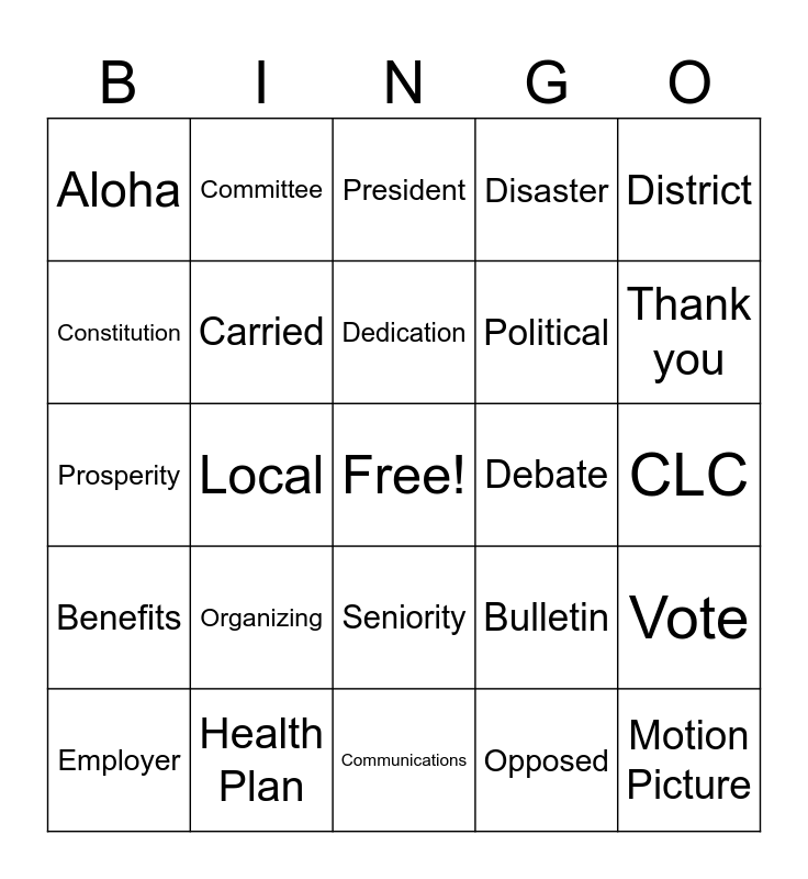 This bingo card has a free space and 73 words: Adjourn, AI, Aloha, Animation, Article, Bargaining, Benefits, Break, Bulletin, Bylaws, Canada, Canadian, Carried, CLC, Collective Agreement, Committee, Communications, Constitution, Convene, Debate, Dedication, Disaster, District, Education, Employer, Executive Board, Fire, General Secretary, Grievance, Hawaii, Health Plan, IATSE Office, In Favour, Leadership, Local, Local 891, Mahalo, Motion, Motion Picture, Officer, Opposed, Organizing, PAC, Party, Point of Order, Political, President, Proceedings, Production, Prosperity, Quadrennial, Resolutions, Robert’s Rule of Order, Safety, Second, Section, Security, Seniority, Sergeant-at-Arms, Skills, Solidarity, Speaker, Tentative Agreement, Thank you, Tradeshow, Training, Training Trust Fund (TTF), Union Meeting, Vote, Workers, Sunscreen, Water and Beach.