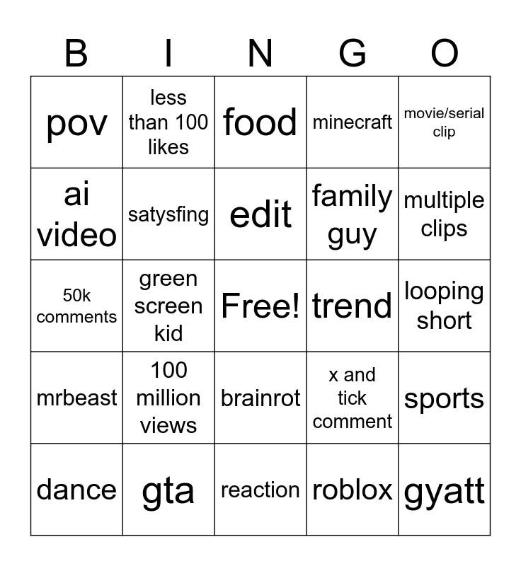 This bingo card has a free space and 24 words: 100 million views, gta, edit, dance, movie/serial clip, pov, ai video, less than 100 likes, trend, brainrot, family guy, 50k comments, x and tick comment, sports, satysfing, roblox, looping short, food, multiple clips, green screen kid, gyatt, mrbeast, minecraft and reaction.
