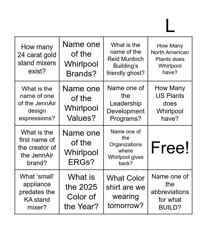 This bingo card has 20 words: Free!, What year was the Whirlpool Corporation Founded?, What is the name of the Reid Murdoch Building’s friendly ghost?, What company other than Whirlpool has their logo displayed on the Reid Murdoch clocktower?, What ‘small’ appliance predates the KA stand mixer?, What is the name of one of the JennAir design expressions?, What is the 2025 Color of the Year?, How many 24 carat gold stand mixers exist?, What is the first name of the creator of the JennAir brand?, Name one of the Whirlpool Brands?, Name one of the Whirlpool ERGs?, Name one of the Organizations where Whirlpool gives back?, Name one of the Whirlpool Values?, Name one of the abbreviations for what BUILD?, Name one of the Leadership Development Programs?, What does WoW stand for?, How Many US Plants does Whirlpool have?, How Many North American Plants does Whirlpool have?, What Color shirt are we wearing tomorrow? and Name another school represented here today other than yours.