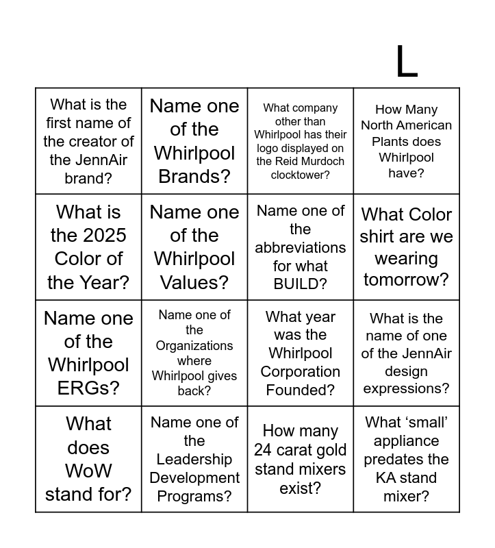 This bingo card has 19 words: What year was the Whirlpool Corporation Founded?, What is the name of the Reid Murdoch Building’s friendly ghost?, What company other than Whirlpool has their logo displayed on the Reid Murdoch clocktower?, What ‘small’ appliance predates the KA stand mixer?, What is the name of one of the JennAir design expressions?, What is the 2025 Color of the Year?, How many 24 carat gold stand mixers exist?, What is the first name of the creator of the JennAir brand?, Name one of the Whirlpool Brands?, Name one of the Whirlpool ERGs?, Name one of the Organizations where Whirlpool gives back?, Name one of the Whirlpool Values?, Name one of the abbreviations for what BUILD?, Name one of the Leadership Development Programs?, What does WoW stand for?, How Many US Plants does Whirlpool have?, How Many North American Plants does Whirlpool have?, What Color shirt are we wearing tomorrow? and Name another school represented here today other than yours.