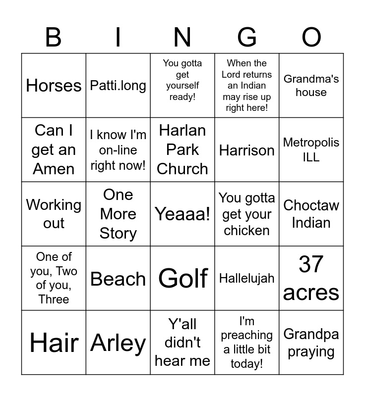 This bingo card has 25 words: Beach, Y'all didn't hear me, Harlan Park Church, Hair, Grandma's house, Horses, Can I get an Amen, Patti.long, You gotta get your chicken, Golf, Harrison, Working out, Hallelujah, 37 acres, I know I'm on-line right now!, Grandpa praying, Choctaw Indian, You gotta get yourself ready!, Metropolis ILL, One More Story, Yeaaa!, Arley, One of you, Two of you, Three, When the Lord returns an Indian may rise up right here! and I'm preaching a little bit today!.