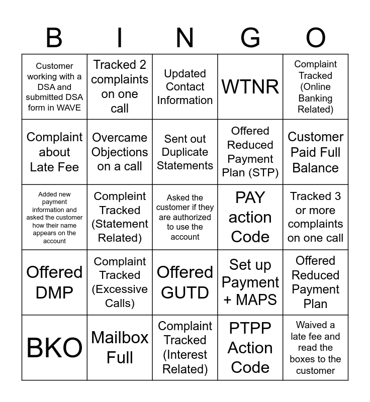 This bingo card has a free space and 24 words: Complaint Tracked (Excessive Calls), Mailbox Full, Sent out Duplicate Statements, BKO, Complaint Tracked (Online Banking Related), Customer working with a DSA and submitted DSA form in WAVE, Complaint about Late Fee, Tracked 2 complaints on one call, PAY action Code, Offered GUTD, Offered Reduced Payment Plan (STP), Added new payment information and asked the customer how their name appears on the account, Set up Payment + MAPS, Offered Reduced Payment Plan, Overcame Objections on a call, PTPP Action Code, Tracked 3 or more complaints on one call, Updated Contact Information, Customer Paid Full Balance, Compleint Tracked (Statement Related), Waived a late fee and read the boxes to the customer, Offered DMP, WTNR and Complaint Tracked (Interest Related).