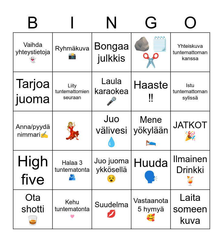 This bingo card has a free space and 24 words: Halaa 3 tuntematonta🫂, Kehu tuntematonta 🩷, Laula karaokea🎤, Ota shotti🥃, Yhteiskuva tuntemattoman kanssa, Vaihda yhteystietoja👻, Tarjoa juoma, Ryhmäkuva📸, Mene yökylään🛌, Juo juoma ykkösellä😵, Haaste ‼️, Anna/pyydä nimmari✍️, Huuda🗣️, Ilmainen Drinkki🍹, Liity tuntemattomien seuraan, Vastaanota 5 hymyä 🥰, JATKOT🎉, Bongaa julkkis, Istu tuntemattoman sylissä, 💃🏼, Laita someen kuva, High five, 🪨🗒️✂️ and Suudelma💋.