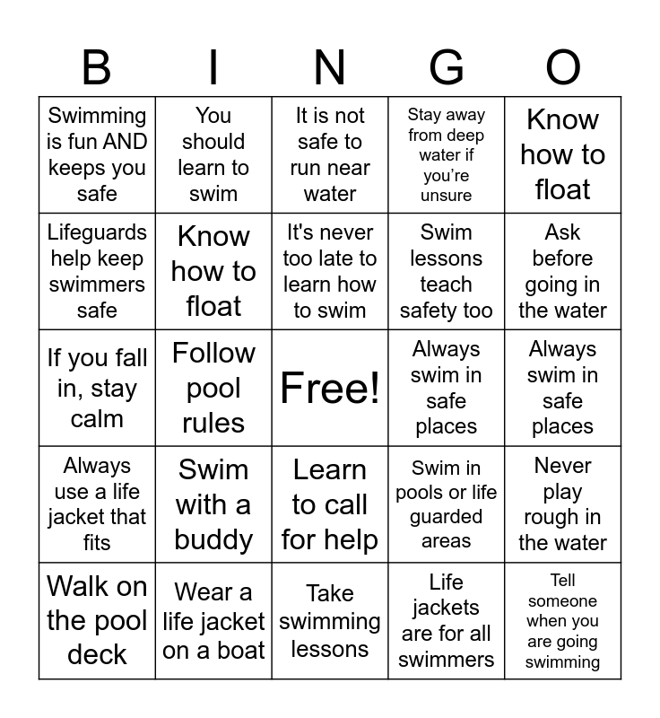 This bingo card has a free space and 24 words: Swim with a buddy, Wear a life jacket on a boat, It's never too late to learn how to swim, Walk on the pool deck, Know how to float, Swimming is fun AND keeps you safe, Lifeguards help keep swimmers safe, You should learn to swim, Always swim in safe places, Learn to call for help, Swim lessons teach safety too, If you fall in, stay calm, Swim in pools or life guarded areas, Never play rough in the water, Know how to float, Life jackets are for all swimmers, Always swim in safe places, It is not safe to run near water, Ask before going in the water, Follow pool rules, Tell someone when you are going swimming, Always use a life jacket that fits, Stay away from deep water if you’re unsure and Take swimming lessons.
