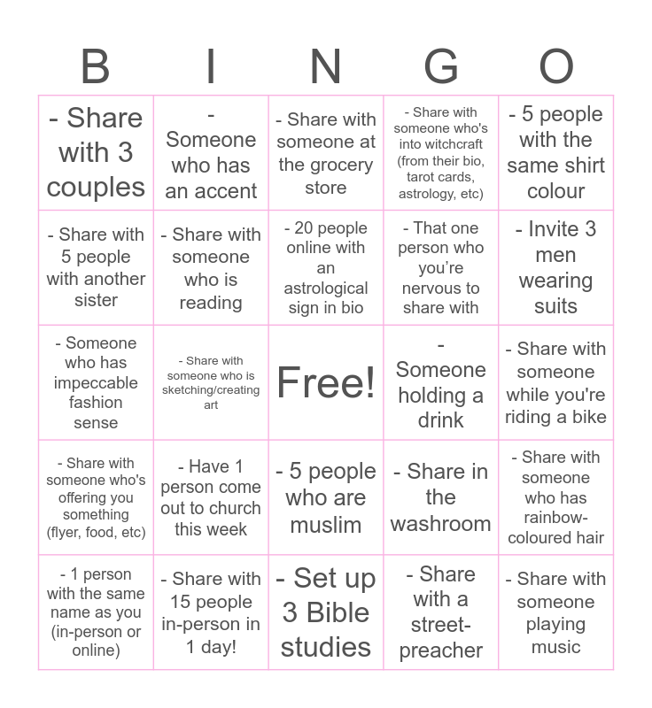 This bingo card has a free space and 24 words: - Have 1 person come out to church this week, - Share with 15 people in-person in 1 day!, - 20 people online with an astrological sign in bio, - 1 person with the same name as you (in-person or online), - 5 people with the same shirt colour, - Share with 3 couples, - Share with 5 people with another sister, - Someone who has an accent, - Someone holding a drink, - 5 people who are muslim, - That one person who you’re nervous to share with, - Someone who has impeccable fashion sense, - Share in the washroom, - Share with someone who has rainbow-coloured hair, - Share with someone who is reading, - Share with a street-preacher, - Share with someone while you're riding a bike, - Share with someone at the grocery store, - Invite 3 men wearing suits, - Share with someone who is sketching/creating art, - Share with someone playing music, - Share with someone who's offering you something (flyer, food, etc), - Share with someone who's into witchcraft (from their bio, tarot cards, astrology, etc) and - Set up 3 Bible studies.