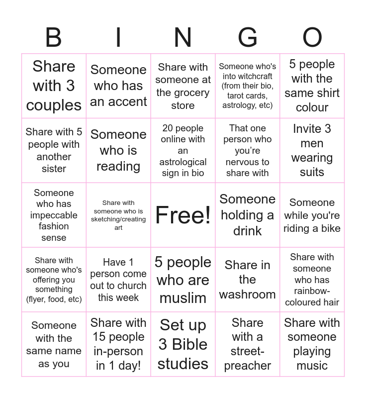 This bingo card has a free space and 24 words: Have 1 person come out to church this week, Share with 15 people in-person in 1 day!, 20 people online with an astrological sign in bio, Someone with the same name as you, 5 people with the same shirt colour, Share with 3 couples, Share with 5 people with another sister, Someone who has an accent, Someone holding a drink, 5 people who are muslim, That one person who you’re nervous to share with, Someone who has impeccable fashion sense, Share in the washroom, Share with someone who has rainbow-coloured hair, Someone who is reading, Share with a street-preacher, Someone while you're riding a bike, Share with someone at the grocery store, Invite 3 men wearing suits, Share with someone who is sketching/creating art, Share with someone playing music, Share with someone who's offering you something (flyer, food, etc), Someone who's into witchcraft (from their bio, tarot cards, astrology, etc) and Set up 3 Bible studies.