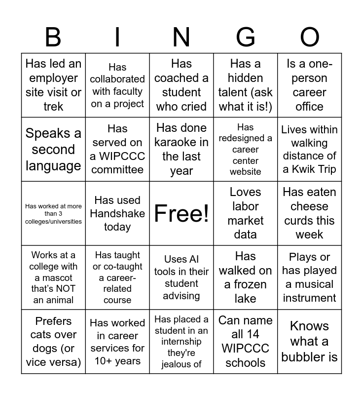 This bingo card has a free space and 30 words: Has worked in career services for 10+ years, Has hosted a virtual career fair, Has used Handshake today, Has done a resume review in the last week, Has led an employer site visit or trek, Has coached a student who cried, Has served on a WIPCCC committee, Uses AI tools in their student advising, Loves labor market data, Has placed a student in an internship they're jealous of, Has eaten cheese curds this week, Knows what a bubbler is, Can name all 14 WIPCCC schools, Has gone to Door County in the last year, Lives within walking distance of a Kwik Trip, Has attended a Packers, Brewers, or Bucks game in person, Has walked on a frozen lake, Works at a college with a mascot that’s NOT an animal, Has taught or co-taught a career-related course, Is a one-person career office, Has worked at more than 3 colleges/universities, Has supervised student workers this year, Has collaborated with faculty on a project, Has redesigned a career center website, Speaks a second language, Has a hidden talent (ask what it is!), Plays or has played a musical instrument, Prefers cats over dogs (or vice versa), Has done karaoke in the last year and Has traveled internationally in the last year.