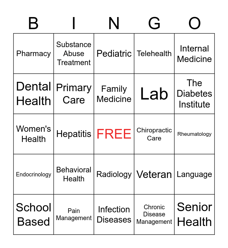 This bingo card has a free space and 24 words: Behavioral Health, Pain Management, Family Medicine, School Based, Internal Medicine, Pharmacy, Dental Health, Substance Abuse Treatment, Chiropractic Care, Radiology, Lab, Women's Health, Veteran, Language, Primary Care, Chronic Disease Management, Rheumatology, Pediatric, The Diabetes Institute, Hepatitis, Senior Health, Endocrinology, Telehealth and Infection Diseases.