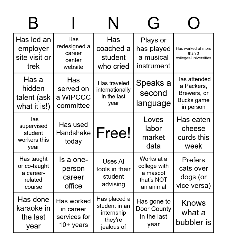 This bingo card has a free space and 30 words: Has worked in career services for 10+ years, Has hosted a virtual career fair, Has used Handshake today, Has done a resume review in the last week, Has led an employer site visit or trek, Has coached a student who cried, Has served on a WIPCCC committee, Uses AI tools in their student advising, Loves labor market data, Has placed a student in an internship they're jealous of, Has eaten cheese curds this week, Knows what a bubbler is, Has gone to Door County in the last year, Lives within walking distance of a Kwik Trip, Has attended a Packers, Brewers, or Bucks game in person, Has walked on a frozen lake, Works at a college with a mascot that’s NOT an animal, Has taught or co-taught a career-related course, Is a one-person career office, Has worked at more than 3 colleges/universities, Has supervised student workers this year, Has collaborated with faculty on a project, Has redesigned a career center website, Speaks a second language, Has a hidden talent (ask what it is!), Plays or has played a musical instrument, Prefers cats over dogs (or vice versa), Has done karaoke in the last year, Has traveled internationally in the last year and Has a special interest (ask what it is!).