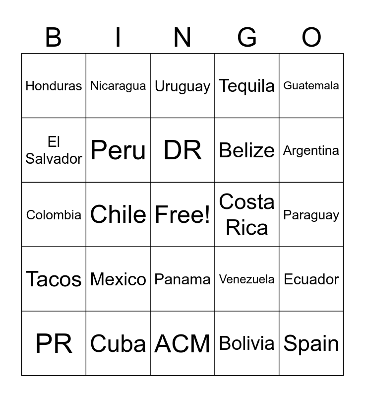 This bingo card has a free space and 24 words: Mexico, Cuba, DR, PR, Guatemala, Honduras, El Salvador, Nicaragua, Costa Rica, Panama, Belize, Colombia, Venezuela, Ecuador, Peru, Bolivia, Paraguay, Uruguay, Argentina, Chile, Spain, Tacos, Tequila and ACM.