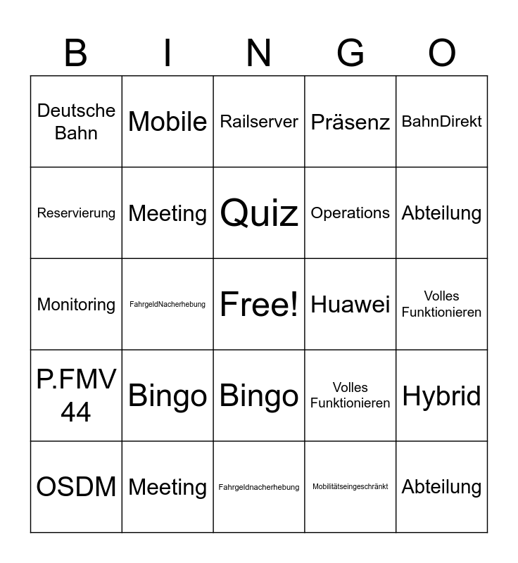 This bingo card has a free space and 48 words: Praktiken, Abteilung, OSDM, Fahrgeldnacherhebung, Bingo, P.FMV 44, Mobile, RiFF, Reservierung, Ticket, Meeting, Präsenz, Hybrid, Volles Funktionieren, 3S, Aktivierung, Quiz, Huawei, Railserver, BahnDirekt, FahrgeldNacherhebung, Mobilitätseingeschränkt, Deutsche Bahn, Operations, Praktiken, Abteilung, OSDM, Fahrgeldnacherhebung, Bingo, P.FMV 44, Mobile, RiFF, Reservierung, Ticket, Meeting, Präsenz, Hybrid, Volles Funktionieren, 3S, Aktivierung, Quiz, Huawei, Railserver, BahnDirekt, Monitoring, Mobilitätseingeschränkt, Deutsche Bahn and Operations.