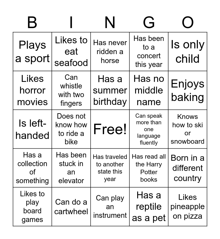 This bingo card has a free space and 24 words: Has been stuck in an elevator, Can do a cartwheel, Has a summer birthday, Likes to play board games, Is only child, Plays a sport, Likes horror movies, Likes to eat seafood, Can speak more than one language fluently, Has traveled to another state this year, Has no middle name, Is left-handed, Has read all the Harry Potter books, Born in a different country, Can whistle with two fingers, Has a reptile as a pet, Knows how to ski or snowboard, Has never ridden a horse, Enjoys baking, Does not know how to ride a bike, Likes pineapple on pizza, Has a collection of something, Has been to a concert this year and Can play an instrument.