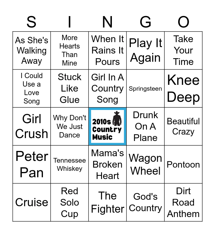 This bingo card has a free space and 30 words: Red Solo Cup, American Kids, Why Don't We Just Dance, Drinkin' Problem, As She's Walking Away, When It Rains It Pours, Stuck Like Glue, Mama's Broken Heart, Drunk On A Plane, The Fighter, Beautiful Crazy, Dirt Road Anthem, God's Country, Need You Now, Knee Deep, The House That Built Me, Wagon Wheel, Peter Pan, Tennessee Whiskey, Take Your Time, Girl Crush, Homegrown, More Hearts Than Mine, Springsteen, I Could Use a Love Song, Play It Again, Pontoon, Cruise, Girl In A Country Song and Body Like A Back Road.