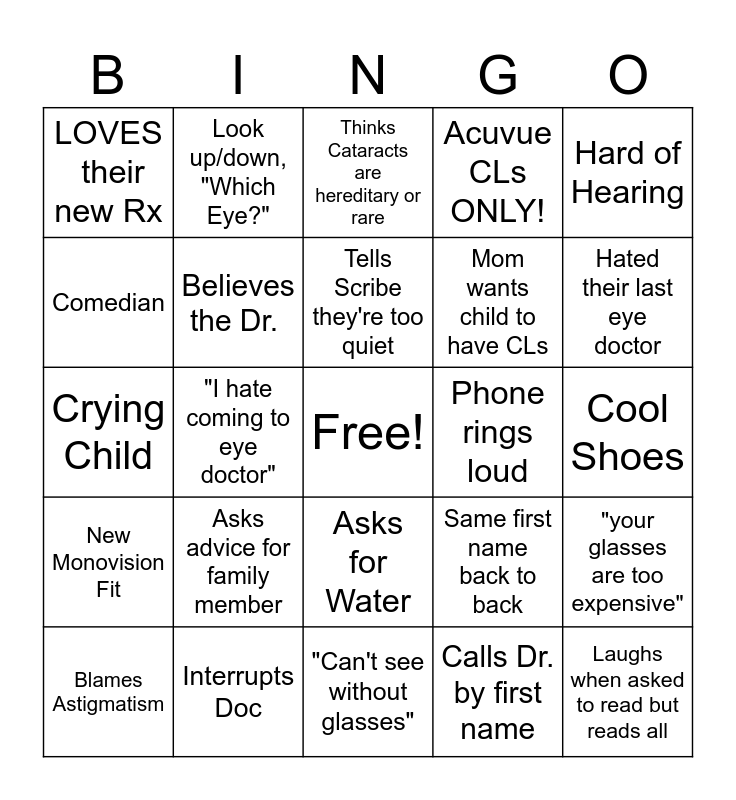 This bingo card has a free space and 24 words: Asks advice for family member, Interrupts Doc, Tells Scribe they're too quiet, Blames Astigmatism, Hard of Hearing, LOVES their new Rx, Comedian, Look up/down, "Which Eye?", Phone rings loud, Asks for Water, Mom wants child to have CLs, Crying Child, Same first name back to back, "your glasses are too expensive", Believes the Dr., Calls Dr. by first name, Cool Shoes, Thinks Cataracts are hereditary or rare, Hated their last eye doctor, "I hate coming to eye doctor", Laughs when asked to read but reads all, New Monovision Fit, Acuvue CLs ONLY! and "Can't see without glasses".